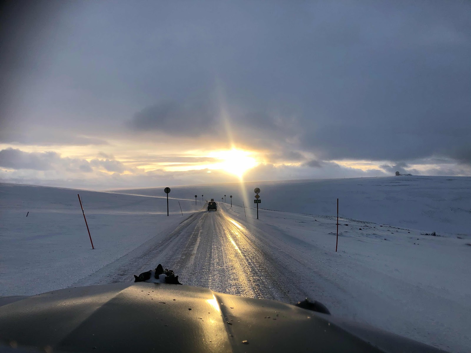 Today wefirst wentup the Northcape again, just because we could. It was a completely different experience than last night. Not only could we now see where we were driving but this time the road was super slippery. We got stuck about 10 km before the gate. And with us almost everybody else as well. The road was so slippery thanTanguy had to stay in the car to keep his foot on the brake, otherwise the car would slide down. So while Tanguy made sure the car would stay on his place I got out to put on the chains. I am getting pretty handy by now so they were on in no time.